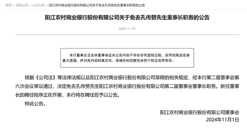 事实上,早在上述通报两天前,即11月1日,阳江农商行董事会发布公告,决定免去孔传赞阳江农商行第二届董事会董事长职务,而新任董事长的任聘程序正在展开。