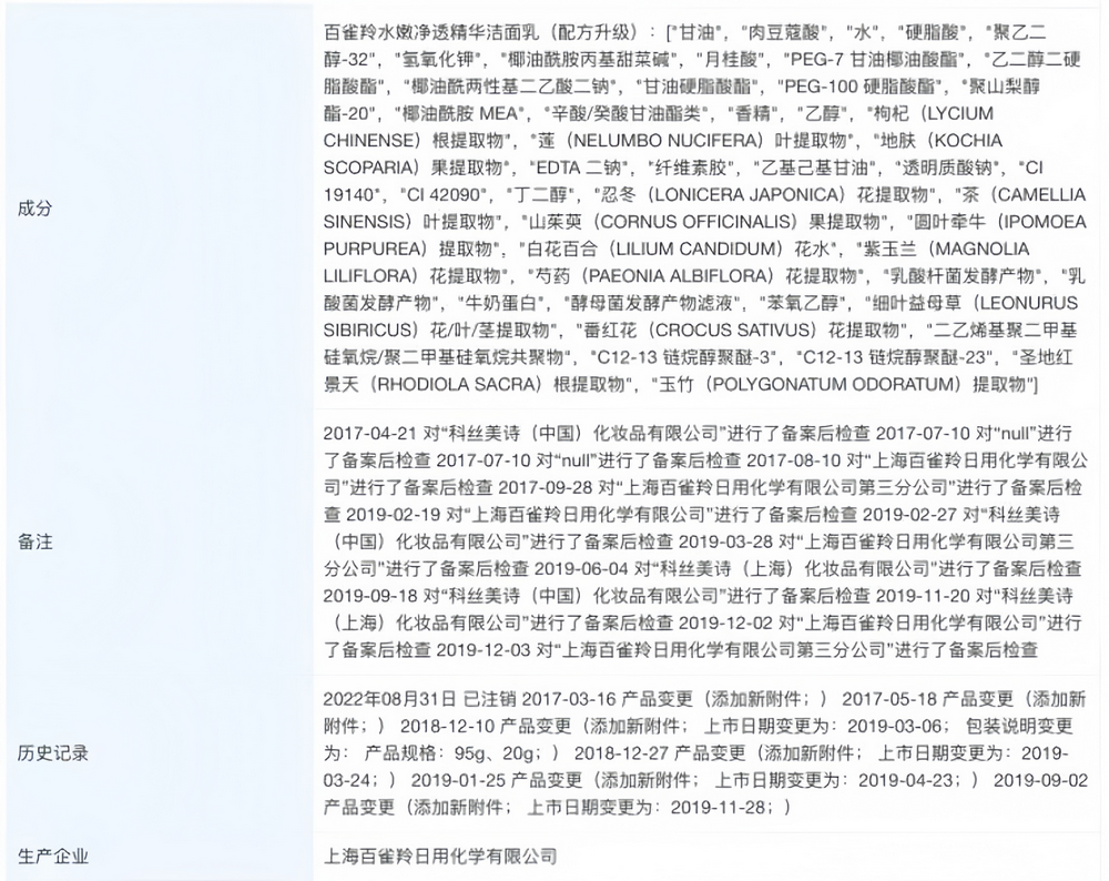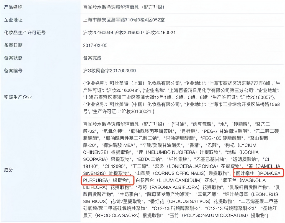 查看百雀羚的国产非特殊用途化妆品备案信息,2017年3月5日备案的“百雀羚水嫩净透精华洁面乳”最后一次含有“圆叶牵牛提取物”成分。而2021年4月25日备案的产品已不含该成分。