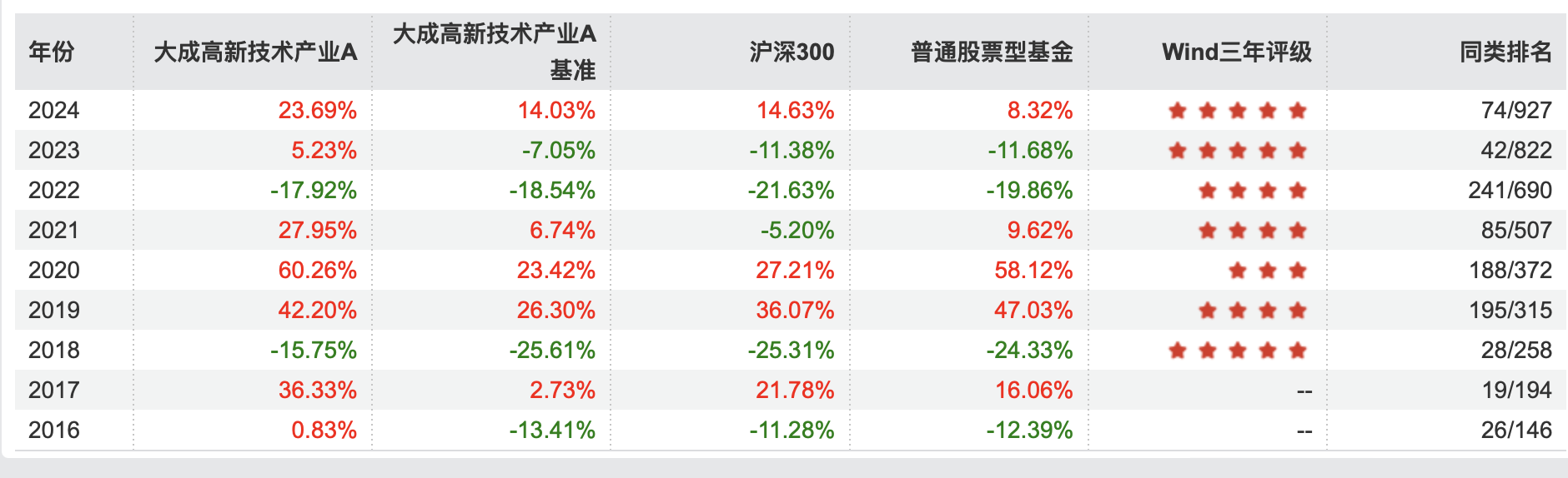 大成高新技术产业基金成立于2015年2月,一开始是徐彦单独管理。2015年7月,刚从研究员转为基金经理的刘旭开始与徐彦合管,2018年9月徐彦退出,此后刘旭单独管理。穿越牛熊,刘旭的超额收益稳定且排名靠前,他的任职回报为335.27%,平均年化收益16.82%,同类排名第一。成立以来,每年都跑赢基准,能做出稳定的超额收益,截至2024年三季度末,大成高新技术的规模已达146亿元。