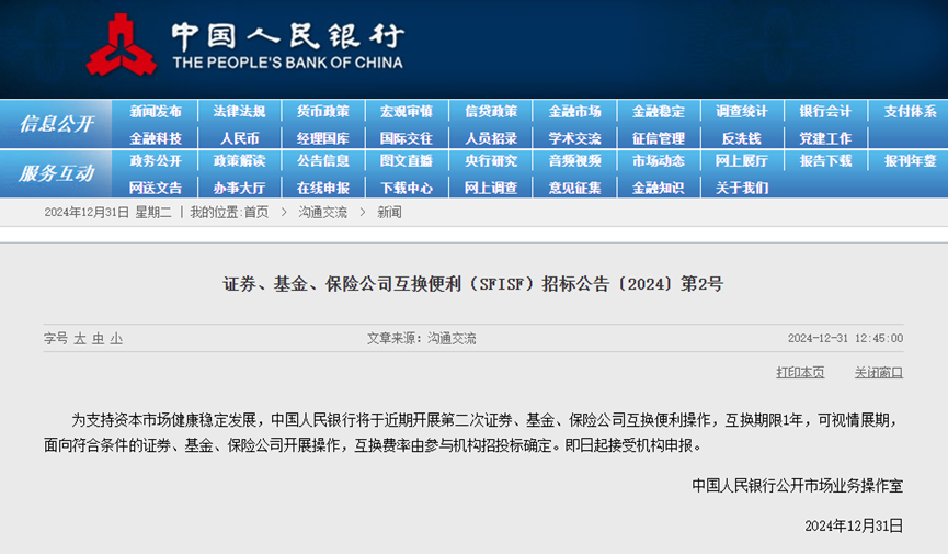 央行同日公告,为支持资本市场健康稳定发展,将于近期开展第二次证券、基金、保险公司互换便利操作,互换期限1年,可视情展期,面向符合条件的证券、基金、保险公司开展操作,互换费率由参与机构招投标确定。即日起接受机构申报。
