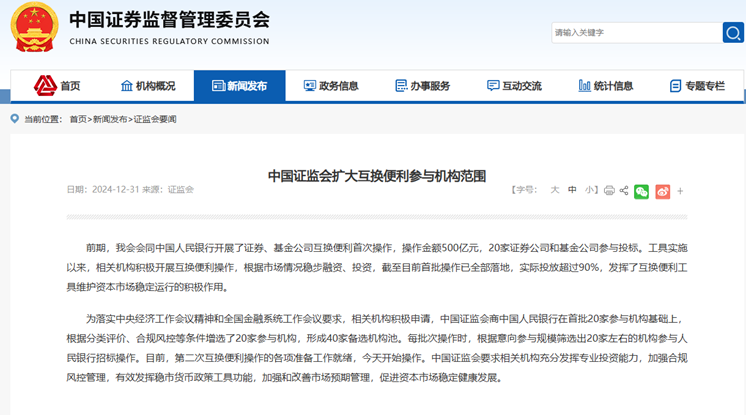 蓝鲸新闻12月31日讯(记者 胡劼) 今日,央行、证监会联合释出重要消息,宣布扩大互换便利参与机构范围至40家,同时今日开始第二次互换便利操作,分析预计规模不少于500亿元。