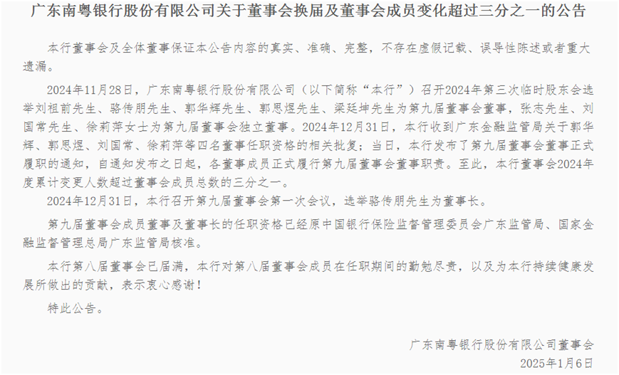 蓝鲸新闻1月8日讯(记者 金磊)近日广东南粤银行官网发布的公告显示,该行已完成董事会换届,其中董事会成员变化超过总数的三分之一,骆传朋再次当选该行董事长。