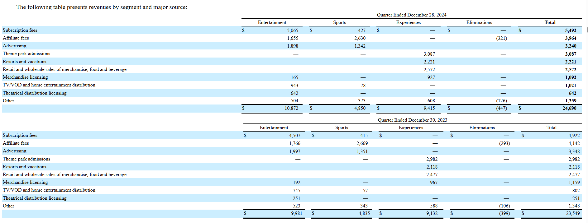 迪士尼公司CEO罗伯特·A.艾格(Robert A. Iger)表示,季度的业绩展示了我们在过去两年推进战略举措时迪士尼的创意和财务实力,在2025财年第一季度,旗下电影工作室有电影在2024年票房排名前三;我们进一步提升了娱乐直接面向消费者(DTC)流媒体业务的盈利能力;我们的体验业务板块继续在全球范围内进行战略性投资,展现了其持久的吸引力。