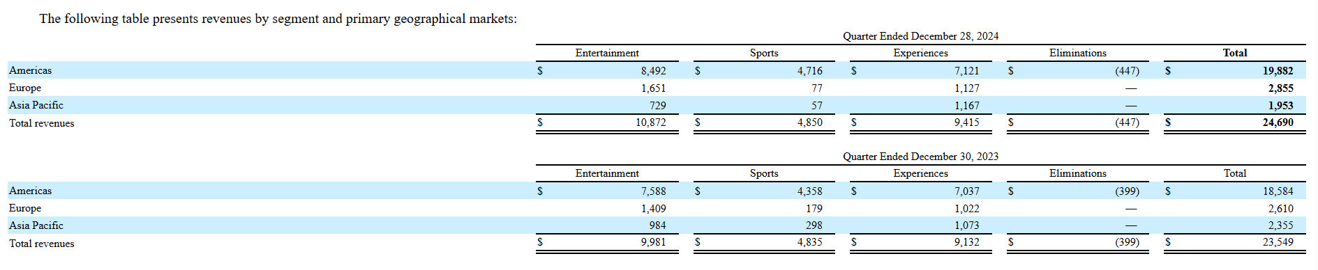 按细分市场和主要地理市场进行划分,2025财年第一季度迪士尼在美洲、欧洲的业务保持增长,在亚太市场收入有所减少。财报显示,2025财年第一季度来自美洲市场的收入为198.82亿美元,同比增长7%;来自欧洲市场的收入为28.55亿美元,同比增长9%;来自亚太市场的收入为19.53亿美元,同比减少17%。