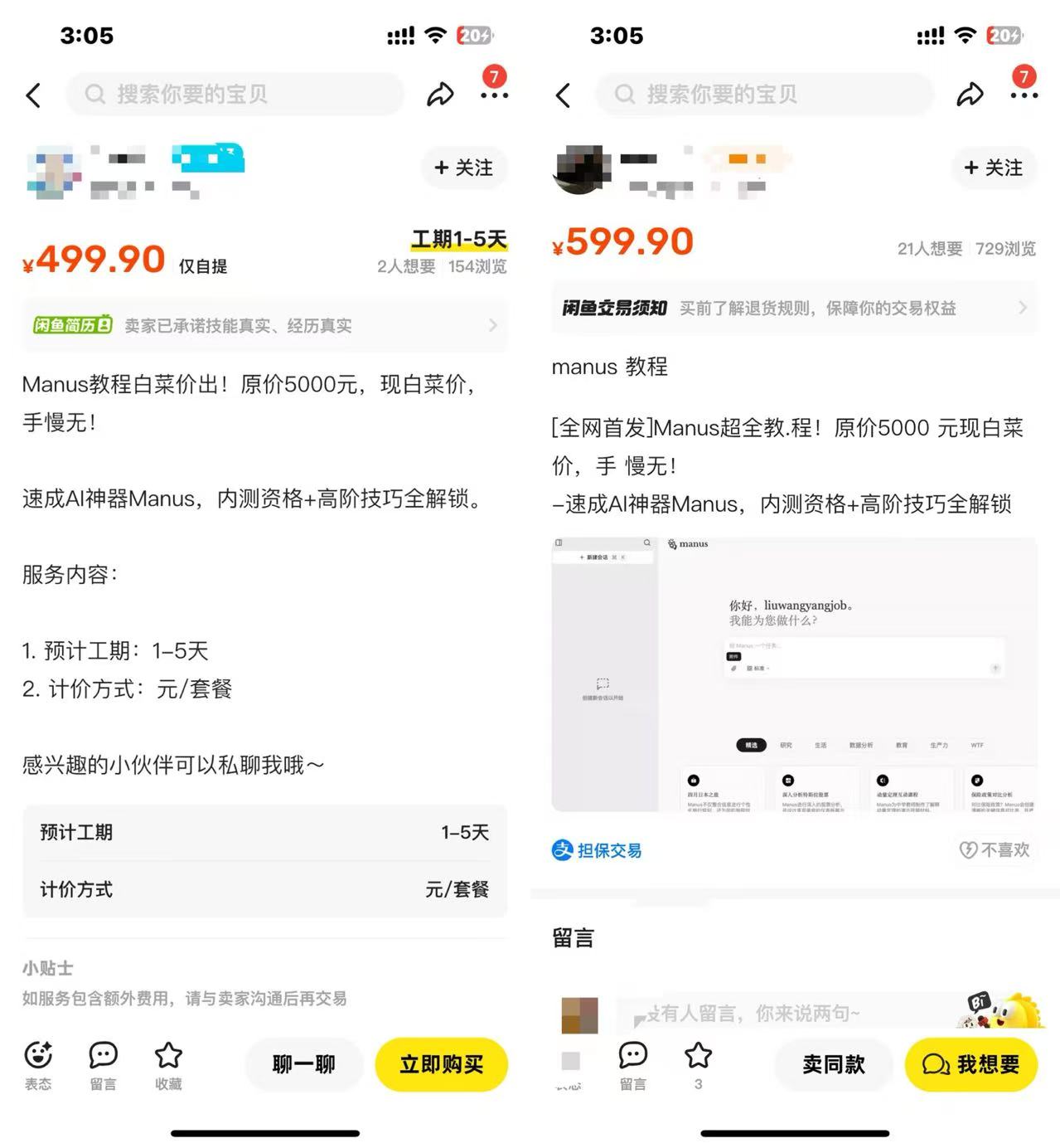 除邀请码外,想靠Manus卖课的人也出现了。目前多个商家售卖单价在500元左右的“Manus使用教程”。由于Manus刚刚开放使用,不仅邀请码数量有限,甚至官网也出现宕机,因此有商家对蓝鲸新闻表示:目前详细教程尚未制作完成,但需求已经不小。