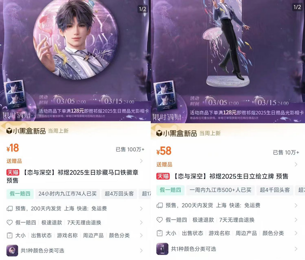 据蓝鲸新闻记者在淘宝平台搜索发现,叠纸心意旗舰店“吧唧”的销量相当可观,最近正在预售的一个男主“生日谷”,销量已突破100万。“由于叠纸的男主生日周边通常只预售一次且不返厂,导致产品在二级市场上的价格被炒高。为了避免未来加价购买,许多玩家都会选择在预售时购买。”