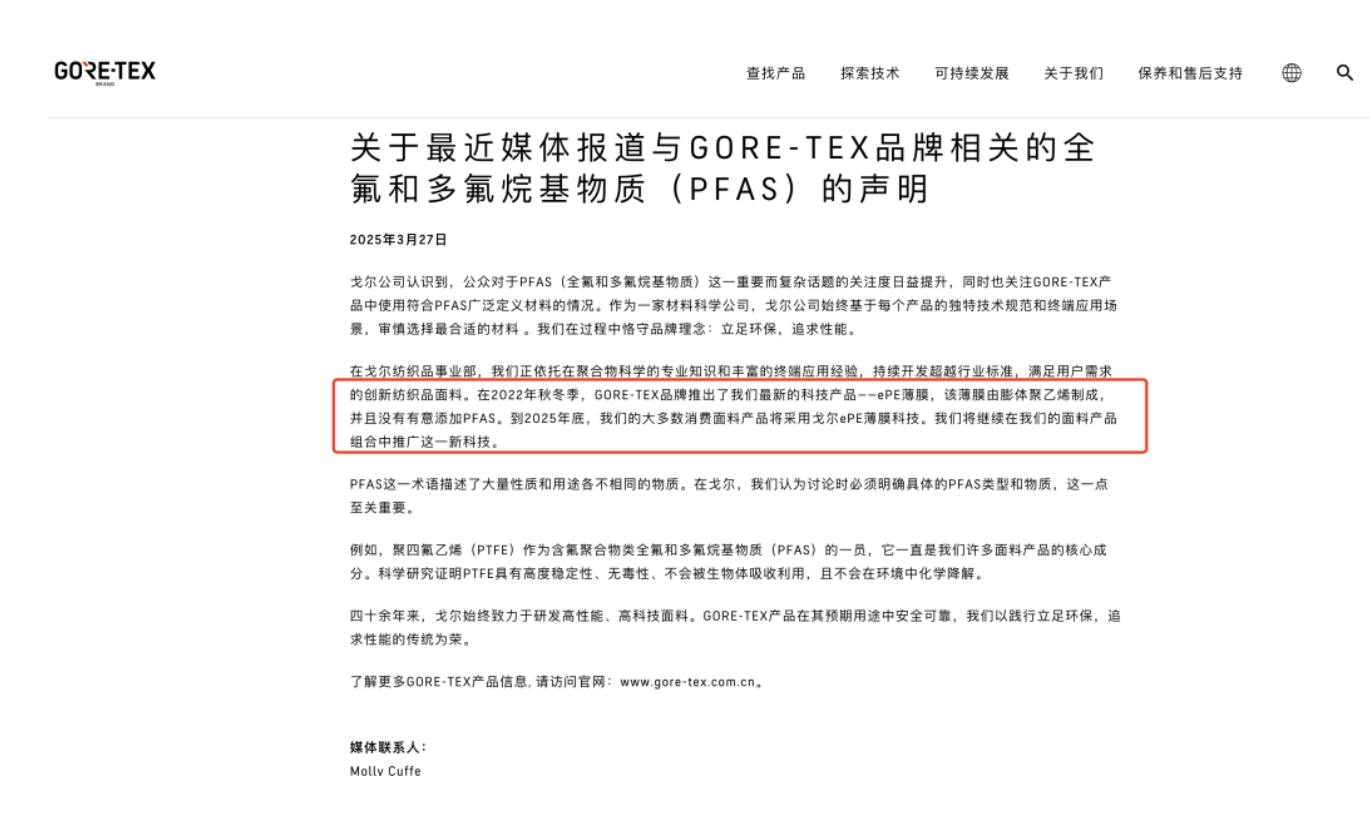 随着舆论的逐渐发酵,3月27日,GORE-TEX面料制造商戈尔公司对此进行了回应,表示已意识到公众对PFAS的关注,将会审慎选择合适材料。