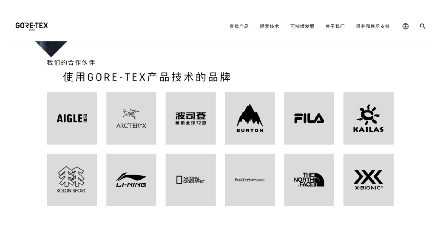 在GORE-TEX官网上可以看到,始祖鸟(ARC’TERYX)、猛犸象(Mammut)、巴塔哥尼亚(Patagonia)、北面(The North Face)等众多一线户外品牌均使用了GORE-TEX的技术。