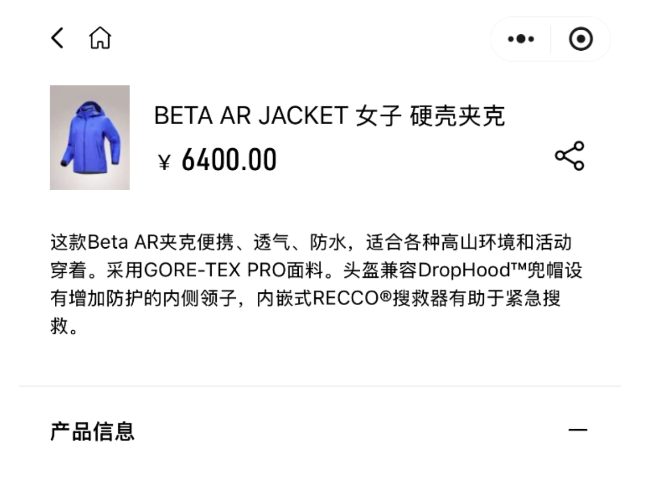 始祖鸟客服回应称:“部分商品确实含有PFAS,具体以款式信息为准。”随后在始祖鸟的微信官方小程序上,记者就一款售价6400元的“BETA AR女子硬壳夹克”进行询问,客服明确表示,该产品中含有PFAS。