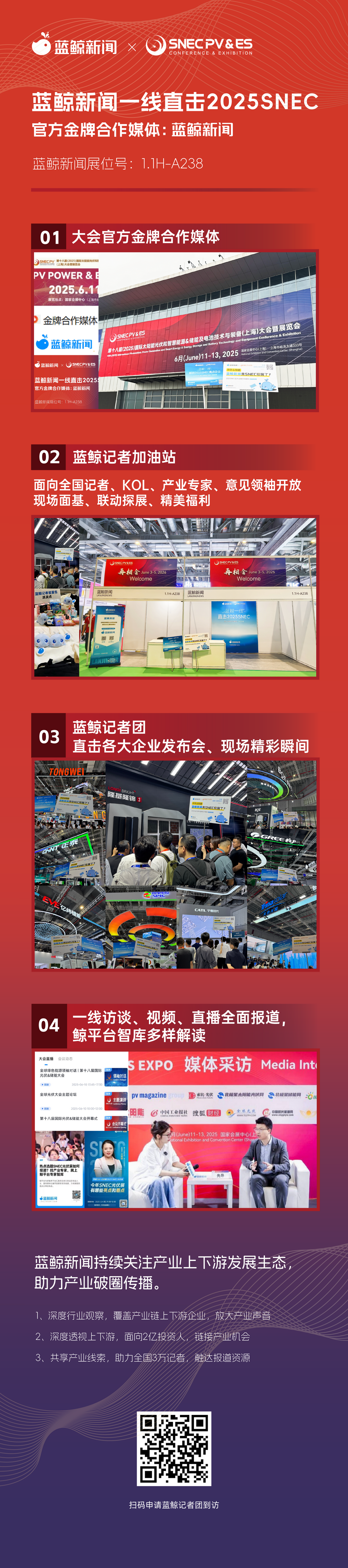 6月11日-6月13日,2025 SNEC光伏展在国家会展中心(上海)举办,该展会为亚洲乃至全球极具影响力的国际化、专业化、规模化的行业盛会,也被誉为“光伏界的春晚”,是全球光伏业发展的“风向标”。蓝鲸新闻受邀为本次大会官方金牌合作媒体,并于现场设置媒体展位、组织记者团探访。