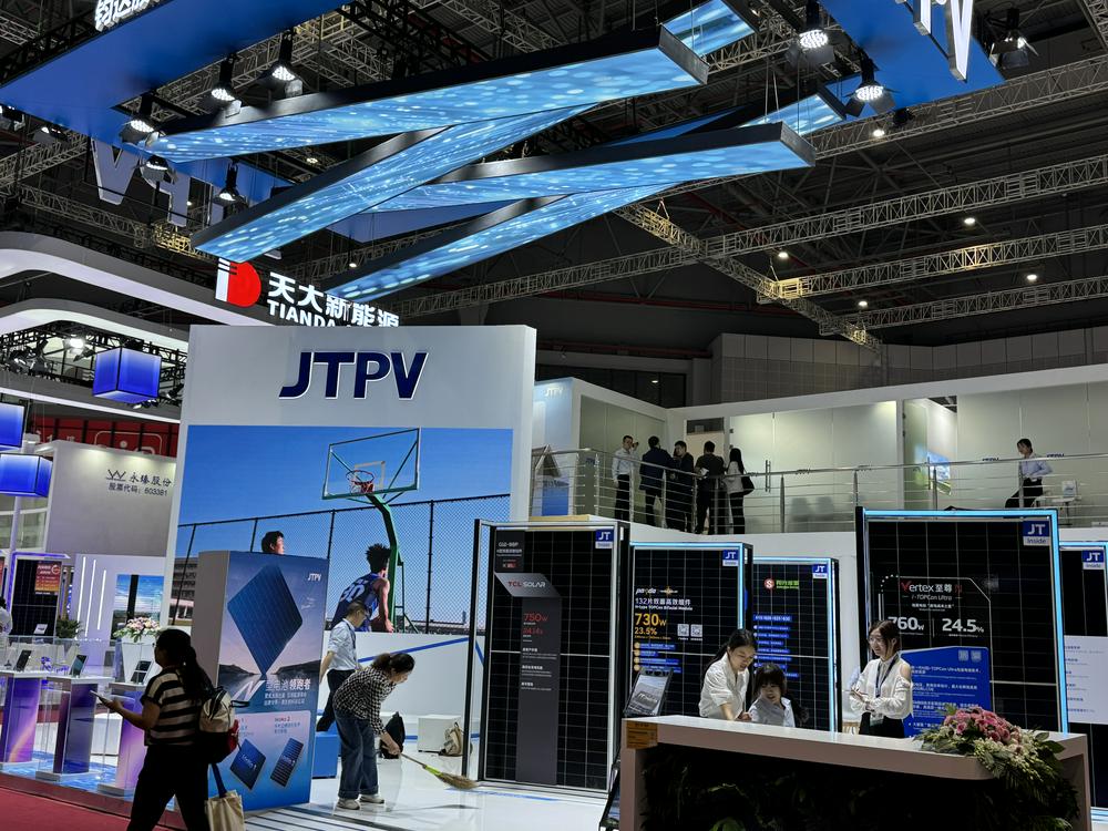 天合光能在现场设置先进技术及场景化展区,展示公司旗下800W+钙钛矿叠层组件、TOPCon2.0旗舰产品以及分布式场景化解决方案。