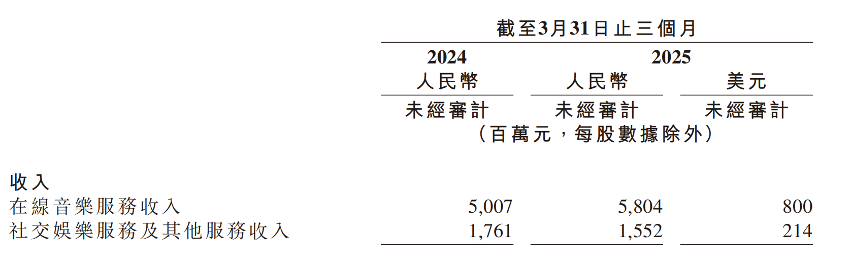 腾讯音乐2025年Q1收入构成。(图源:腾讯音乐2025年Q1财报)