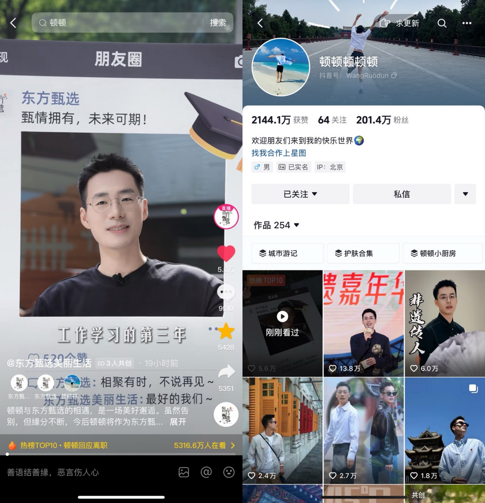 主播顿顿同样走红于2022年夏天那阵知识带货风潮中,当时他凭借英语绕口令、诗词即兴创作等才艺脱颖而出,逐渐积累起自己的核心粉丝群。顿顿目前在抖音拥有200余万粉丝,是东方甄选在职主播中粉丝量最多的。