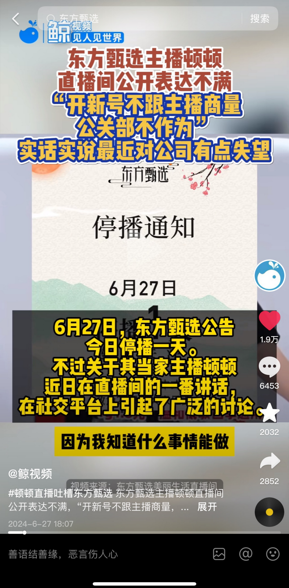另一方面,东方甄选主播在直播体系中的话语权正在弱化——顿顿曾在直播中透露,公司现在很多事情不跟主播商量,开新账号也不跟主播商量沟通。又一次,东方甄选内部的管理问题被暴露于台前。
