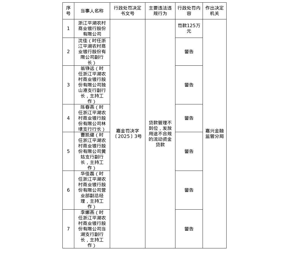 浙江平湖农商行被罚125万,涉贷款管理不到位等
