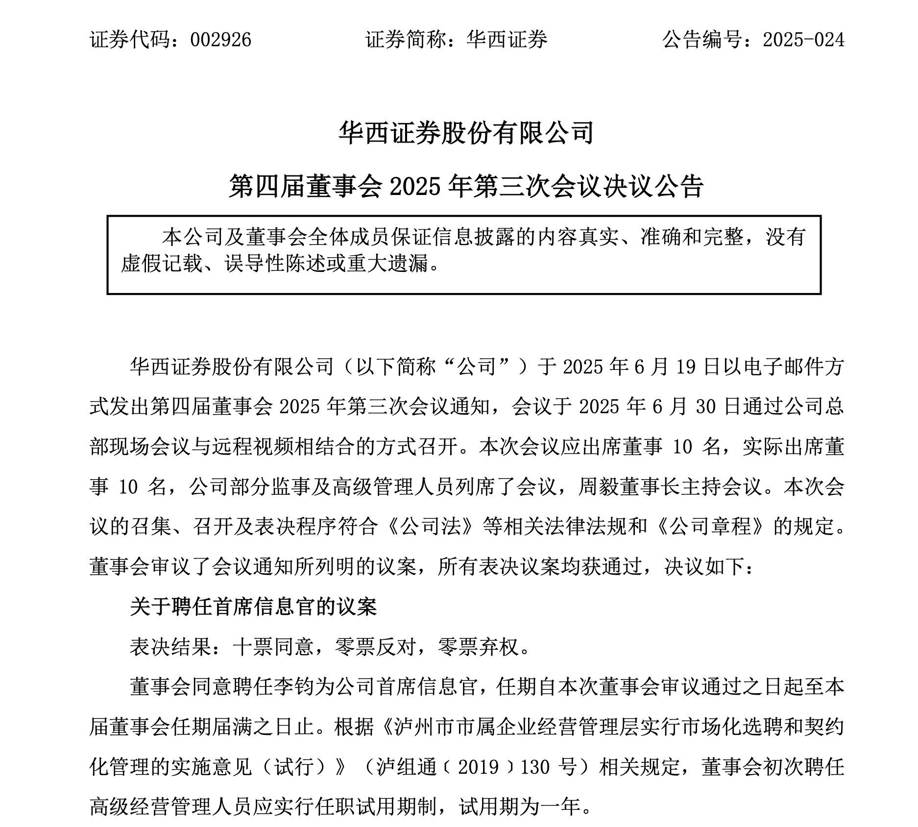 蓝鲸新闻7月1日讯(记者 王婉莹)今日,华西证券(002926.SZ)公告称,公司第四届董事会2025年第三次会议审议通过议案,聘任李钧担任公司首席信息官。李钧的任期自董事会审议通过之日起至第四届董事会任期届满之日止,根据相关规定,董事会初聘高管实行任职试用期制,试用期为一年。