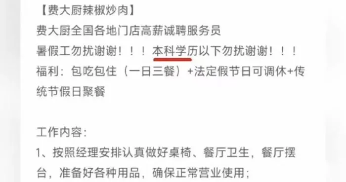 该事件起因是,近日有网友发帖称,费大厨辣椒炒肉一门店招聘服务员,月薪五千到六千元,要求“本科学历以下勿扰”。工作内容为做好餐厅桌椅相关卫生清洁工作,并在接待顾客时主动热情。