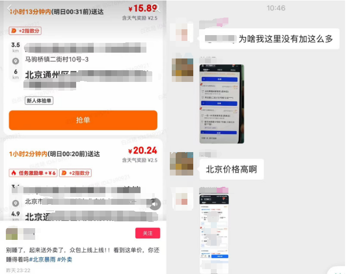 骑手们发布的接单截图显示,北京暴雨影响下,一单的收入甚至可以上探到20元以上。社交平台上,有北京地区的骑手表示,6个小时挣了700块。