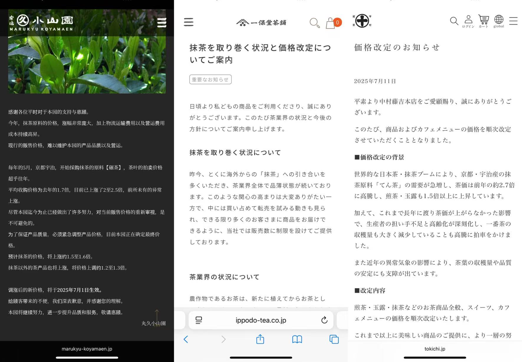 多家日产抹茶品牌的新一轮涨价公告