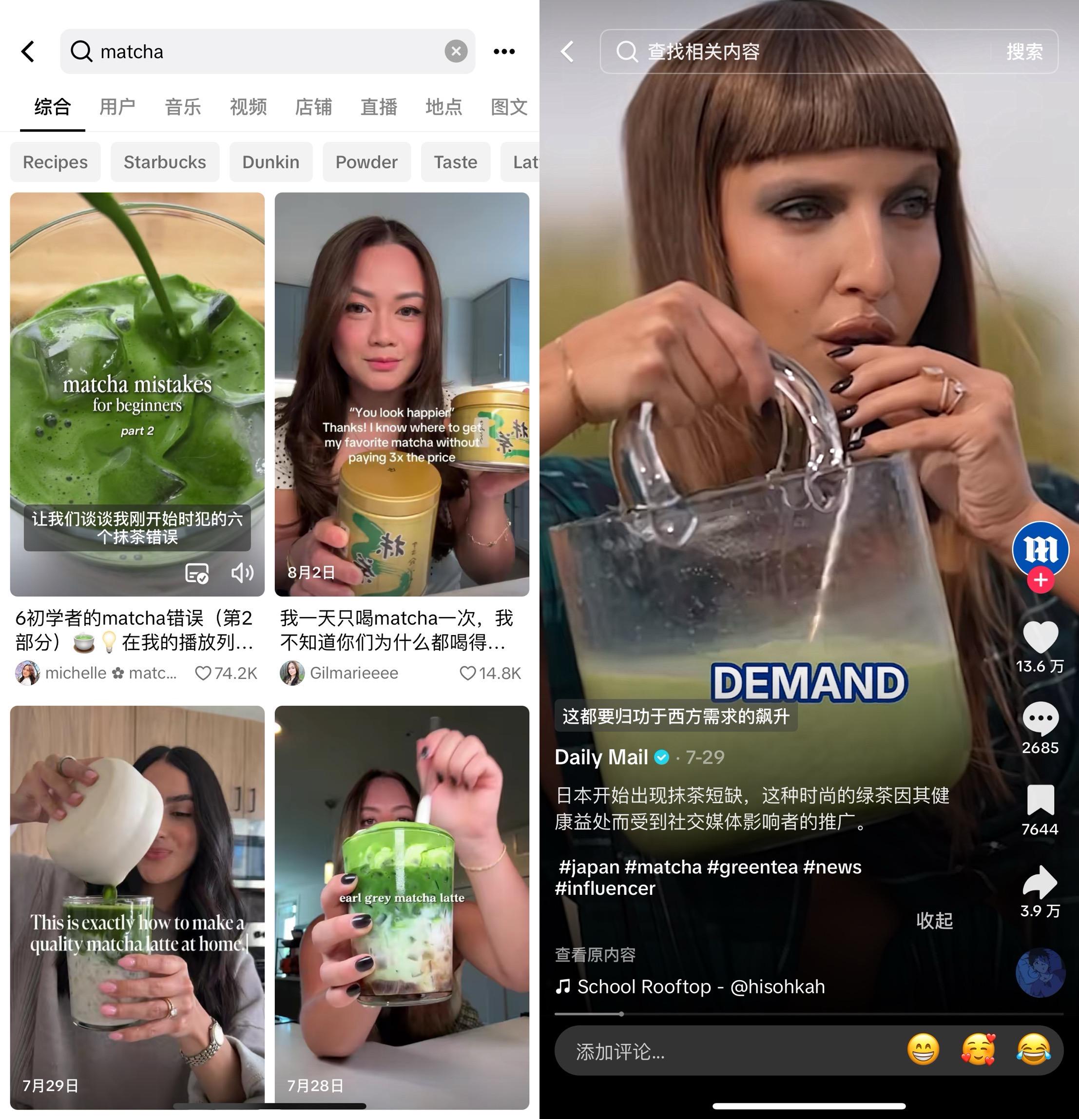 伴随星巴克等抹茶系列产品的热销、明星名人在社交媒体上的分享,抹茶自去年起加速占领欧美市场。在TikTok上,关于抹茶的食品动辄收获数千上万甚至几十万的点赞,#matchalatte(抹茶拿铁)这一话题标签下的作品已多达75万件。《经济学人》文章提到,伦敦的Blank Street咖啡店声称它在美国和英国的商店每4秒就能卖出一杯抹茶饮品。