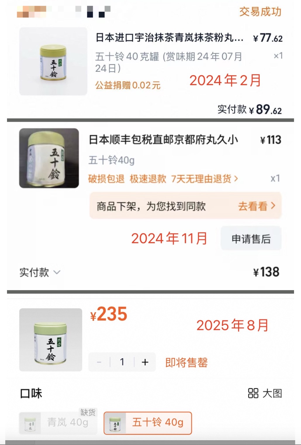 有消费者表示,去年2月还可以7、80块买到丸久小山园的“五十铃”(40克罐装), 但现在这款产品在电商平台上的售价已涨至235元甚至更高——一年半时间涨近200%。照此计算,抹茶的涨幅已经超过了同期黄金、比特币和英伟达的股票。