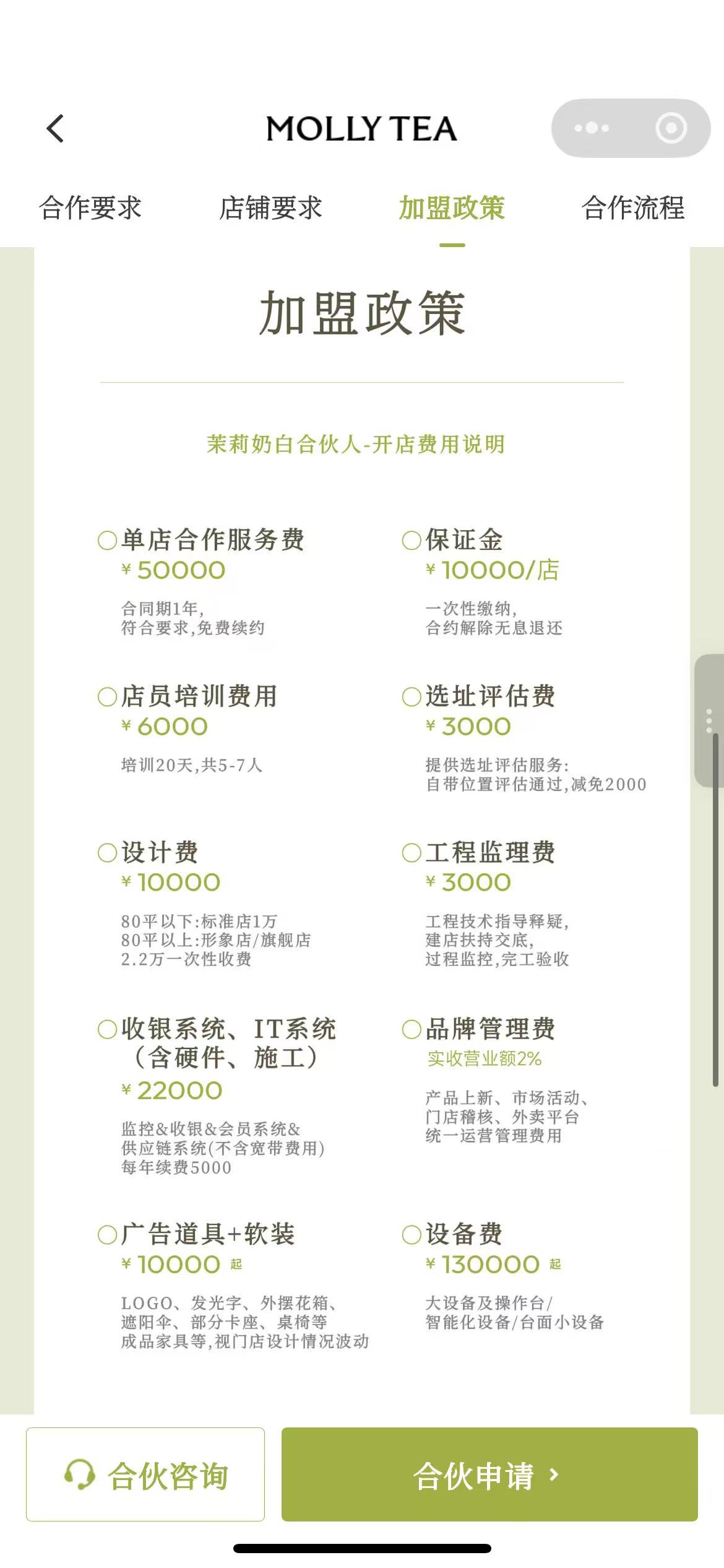 蓝鲸新闻了解到,茉莉奶白以加盟形式为主,前期投入不含店铺租金在50万元左右,这在整个新茶饮行业中都属于较高水平。而这其中不仅包含单店合作费用等,还有大量与选址、装修、工程监理直接相关的费用。
