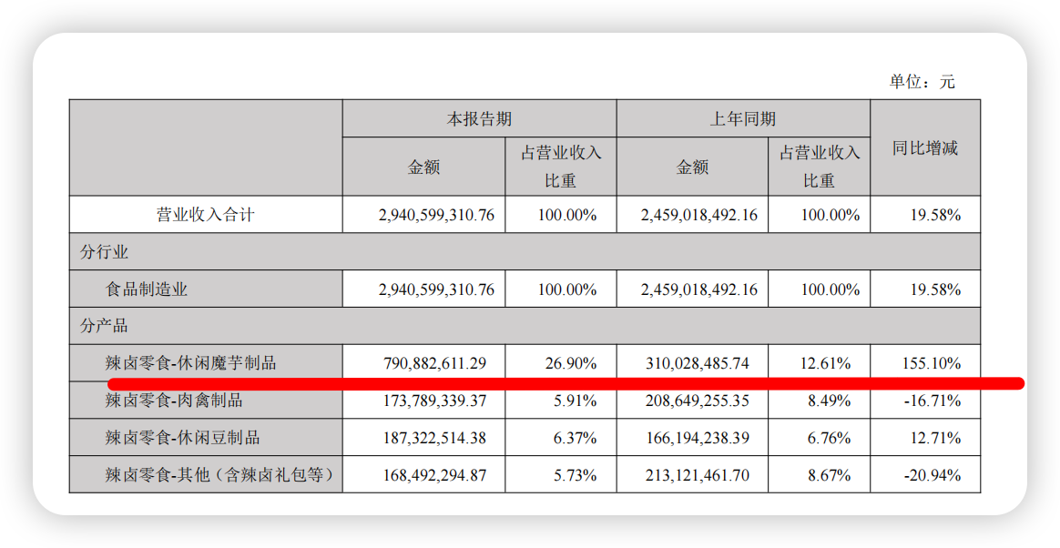 无独有偶,日前另一个行业巨头卫龙美味(09985.HK)发布的半年报显示,其总收入34.83亿元,同比增长18.5%,净利润7.36亿元,同比增长18.5%。其中以魔芋爽为主的蔬菜制品营收占比增至60.5%。