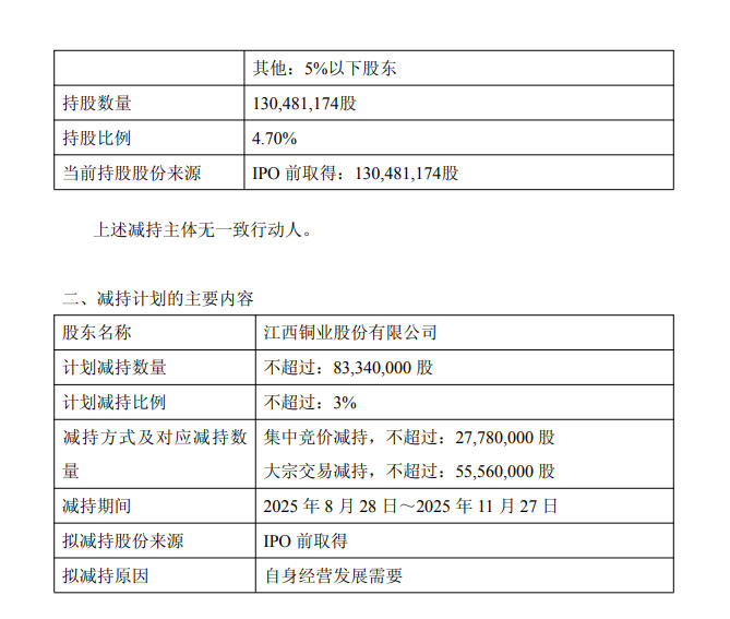 公告显示,江铜股份因自身经营发展需要,计划自公告之日起3个交易日后的3个月内通过集中竞价方式及/或大宗交易方式合计减持公司股份不超过8334万股,不超过公司总股本的3%。其中通过集中竞价交易方式减持不超过2778万股,即不超过公司总股本的1%;通过大宗交易方式减持不超过0.56亿股,即不超过公司总股本的2%。