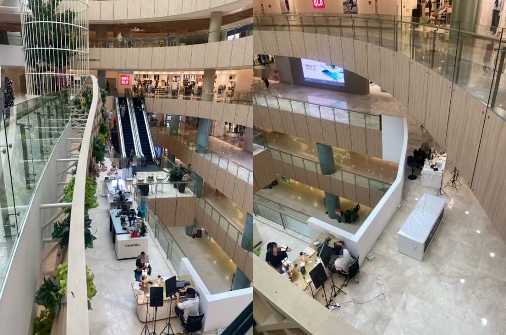 近日有网友向蓝鲸新闻爆料称,在广州某商场的一楼看到多个直播布景。这些直播间搭建在商场一楼的走廊上,直播桌面摆着产品,围挡上写着品牌名称,露出品牌包括香奈儿、兰蔻、莱珀妮等。值得注意的是,这家商场并无前述品牌的官方门店。对此,网友质疑或有主播租用摊位假冒品牌专柜。