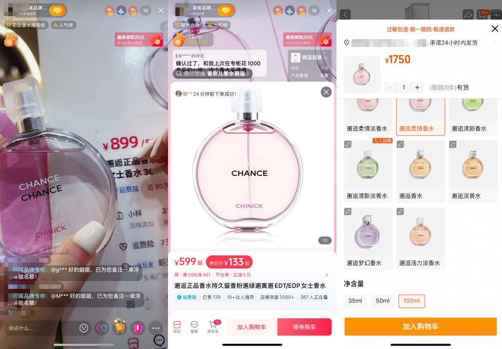 以某个背景为香奈儿门头的直播间为例,主播称其是广州万象城三楼的香奈儿专柜,柜员迫于业绩压力将正品优惠出售。该直播间小黄车中的香奈儿粉邂逅女士香水(100ml)售价499元,而官方旗舰店同款产品的售价则在千元以上,价差过大。