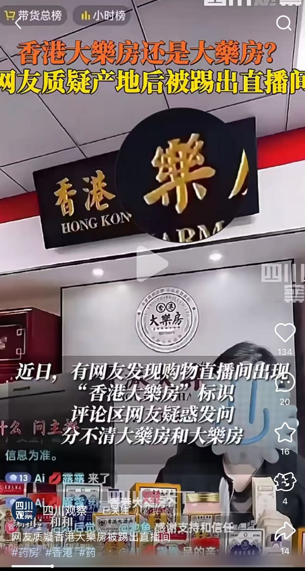 据羊城网报道,很多商家会以“香港大药房”之名冒充香港百年老字号,大肆制造并销售冒牌药品,相关直播间还会露出“香港大药房”的门店牌匾作为背书。有意思的是,一些主播因为不认识繁体字,错将背景的“香港大药房”写成“香港大乐房”,令人啼笑皆非。