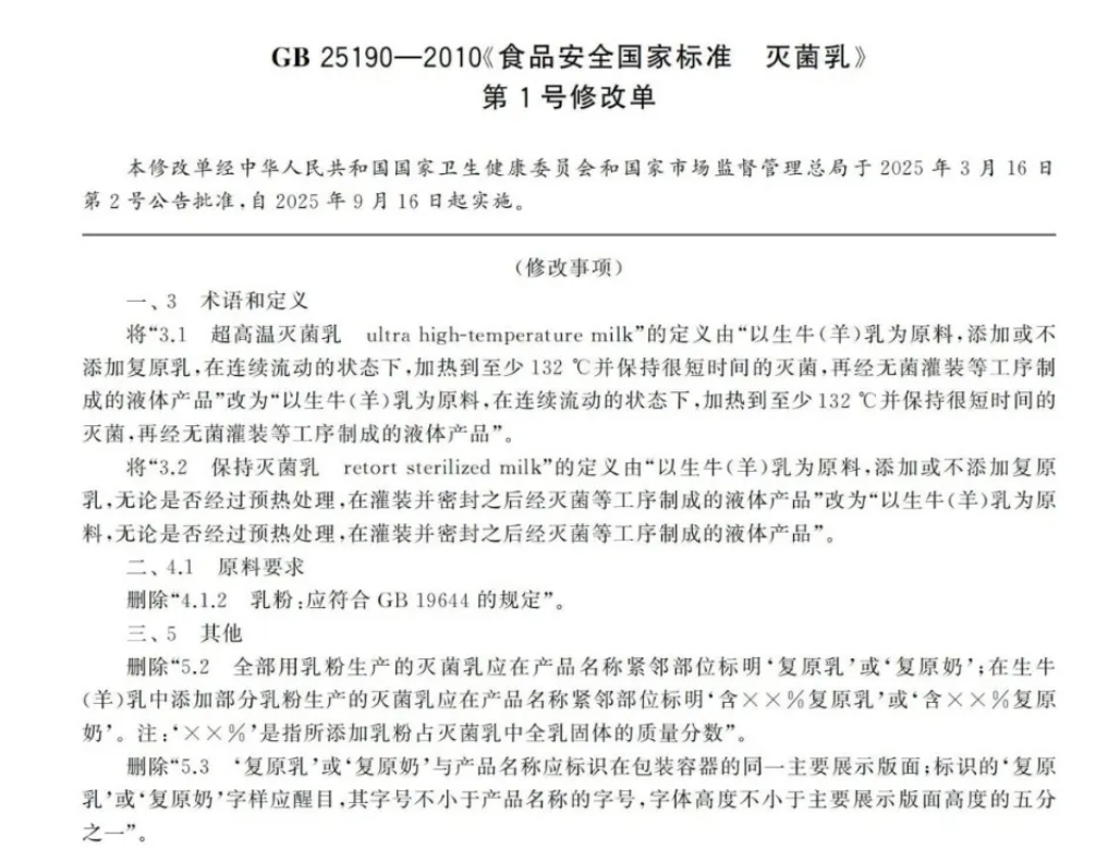该修改单删除了原标准中“添加或不添加复原乳”的表述,并剔除了所有涉及“乳粉”的内容,彻底禁止了复原乳在纯牛奶生产中的应用。