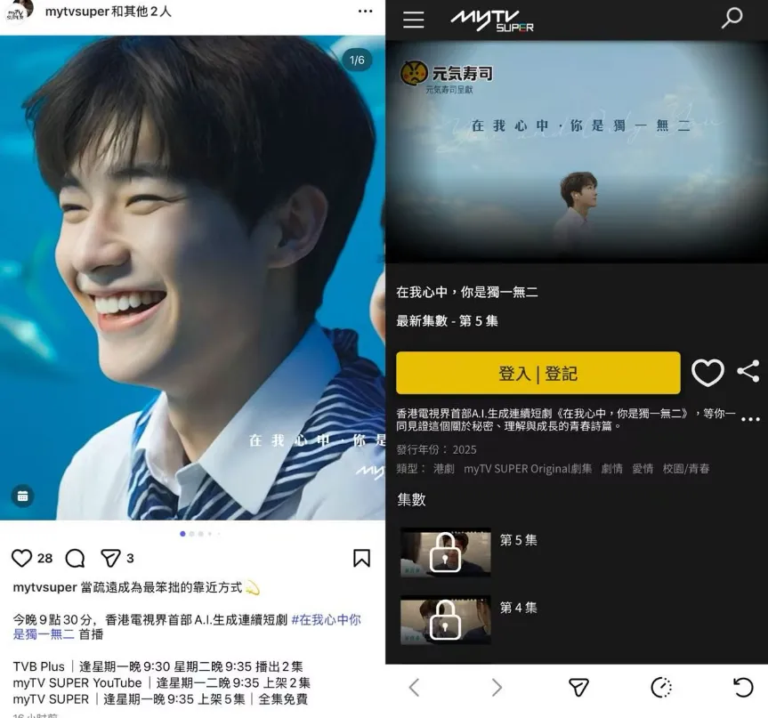 蓝鲸新闻9月16日讯(记者 汤诗韵)香港电视界首部AI生成青春校园爱情短剧《在我心中,你是独一无二》于9月15日登陆myTV SUPER及TVB Plus。该剧由TVB Plus制作、myTV SUPER出品,每集不超2分钟。剧集为周更,可免费收看。