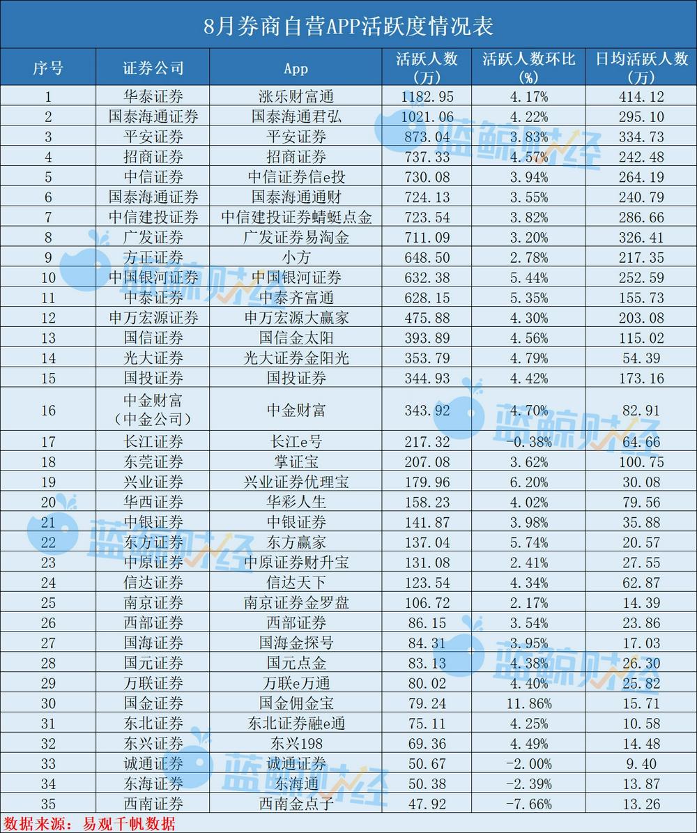 券商阵营中,11家券商App的月活人数突破500万。2家券商App迈入千万量级,华泰证券涨乐财富通以1182.95万月活居首,国泰海通君弘月活1021.06万且系年内首次破千万。
