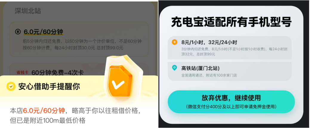 在深圳北站,蓝鲸科技记者使用美团共享充电宝时,显示收费为6元/60分钟,24小时封顶30元,总封顶99元,并主动提示“当前价格较过往偏高”;厦门北站的怪兽充电价格更高,达到每小时8元,封顶标准相近。