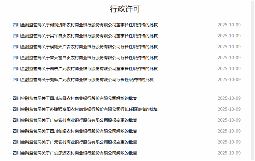 10月9日消息,四川金融监管局发布关于广元农村商业银行股份有限公司、广安农村商业银行股份有限公司、自贡农村商业银行股份有限公司股权变更的批复。