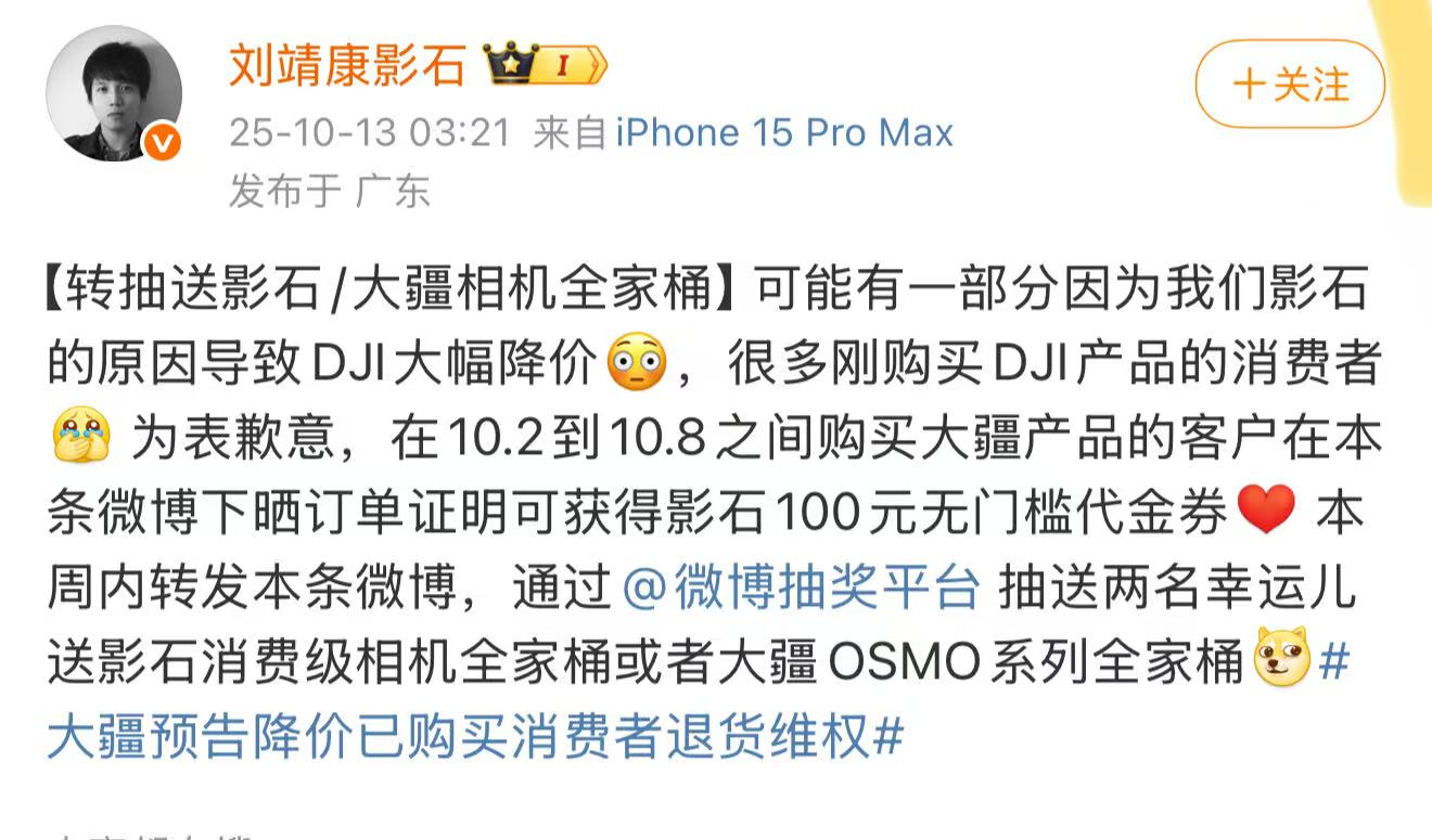 就在大疆降价风波仍未平息之时,其竞争对手影石的创始人兼CEO刘靖康于10月13日在微博发声,表示“可能有一部分影石的原因导致DJI大幅降价”,并承诺为10月2日至8日期间购买大疆产品的消费者提供100元影石无门槛代金券作为补偿,同时还发起抽奖活动,赠送影石或大疆的全家桶产品。