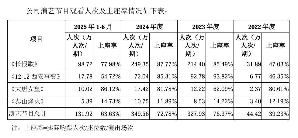 虽是最大利润来源,但《长恨歌》如今面临上座率下滑的风险,2022 年至 2025年 1-6月,《长恨歌》上座率分别为47.03%、85.49%、87.77%、77.98%。陕西旅游同样意识到了这一问题,招股书中提到,尽管公司通过冬季版更新、舞台技术升级和演员梯队建设等多种方式实现了产品的创新,但存在观众审美疲劳和市场吸引力下降的潜在风险。