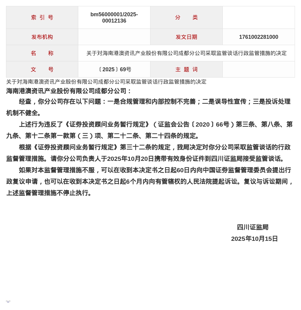 蓝鲸新闻10月21日讯,近日,四川证监局发布政监管措施决定,剑指海南港澳资讯产业股份有限公司成都分公司。