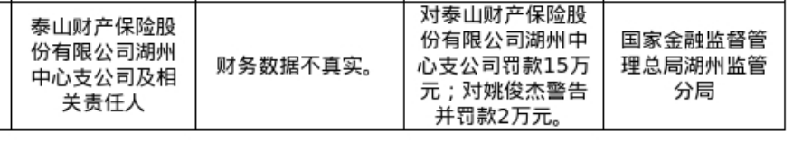 泰山财险湖州中支被罚15万,涉财务数据不真实