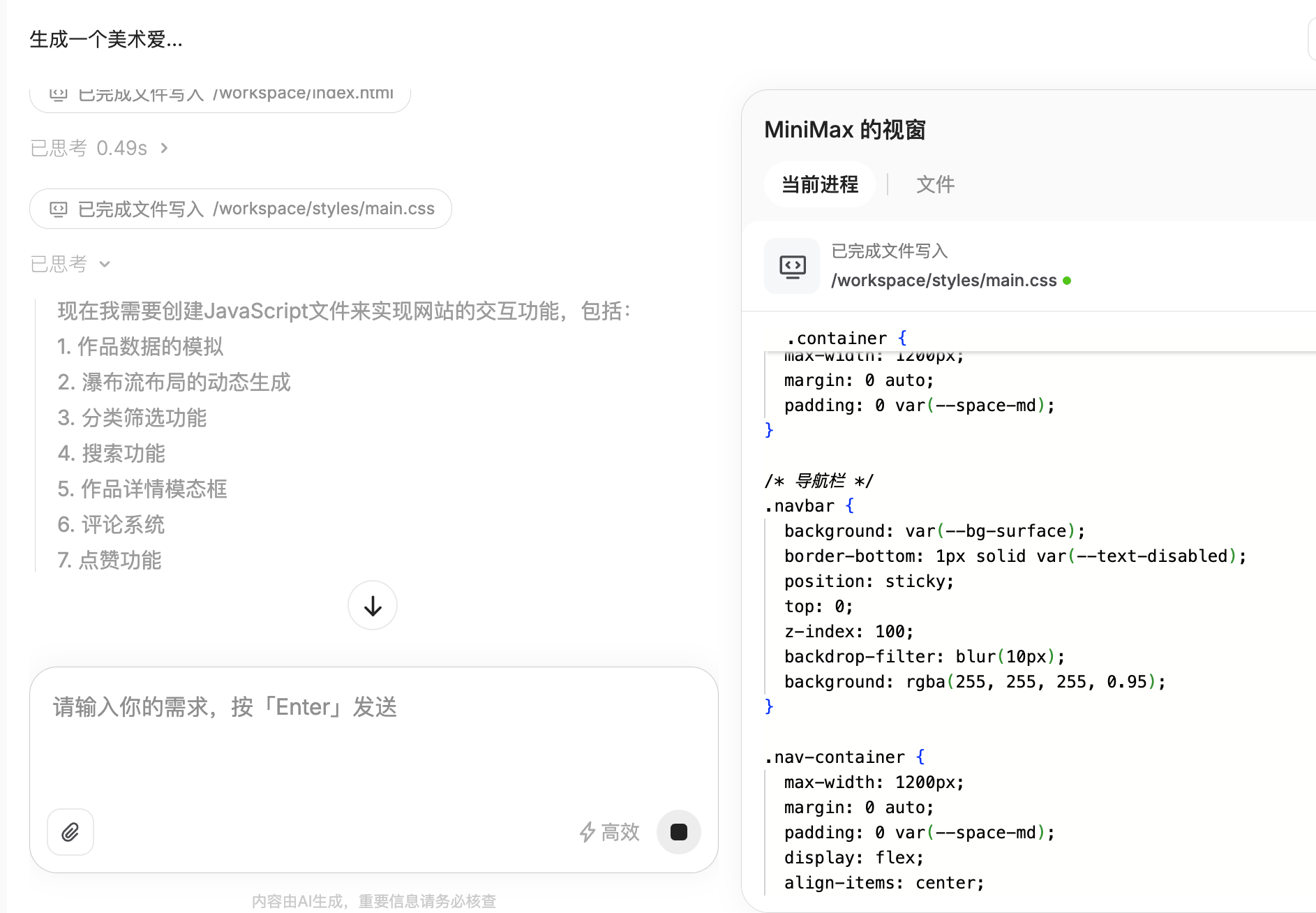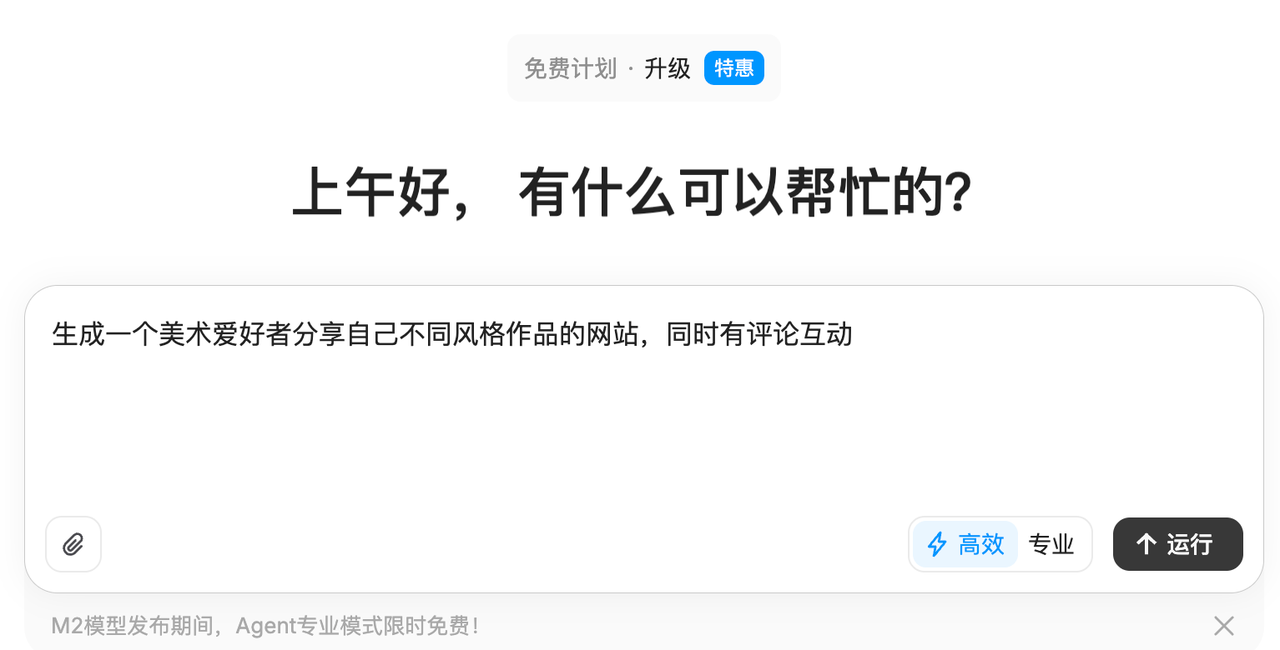 在实验中,当记者向 M2 提供一条关于“制作美术爱好者个人网站”的 Agent 指令后,系统迅速理解需求并自动定义目标任务,生成了多阶段的执行计划。整个任务被拆解为近 10 个步骤,包括内容生成、前端结构设计、样式渲染、资源调用等环节。右侧窗口实时显示 Agent 的执行进程,从任务分解到页面生成,几乎全程自动化完成。