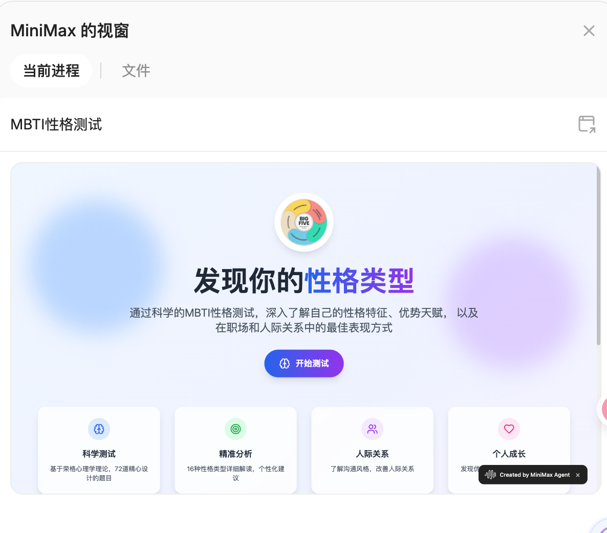 不过在第一次打开该文件时,发现页面出现了乱码。向 Agent 反馈后,M2 立即识别出问题可能与编码或浏览器设置有关,自动进入问题排查流程。经过几轮自动修复与重新生成,Agent 最终输出了一个结构清晰、样式统一、视觉审美在线的网页版本。从用户体验角度看,这种问题响应与动态调整的能力,已接近一个轻量级网页开发助手的水平。