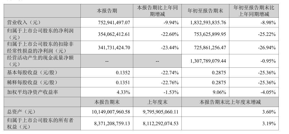 公告显示,第三季度营收为7.53亿元,同比下降9.94%;净利润为3.54亿元,同比下降22.60%。前三季度整体营收为18.33亿元,同比下降8.98%;净利润为7.54亿元,同比下降25.22%。