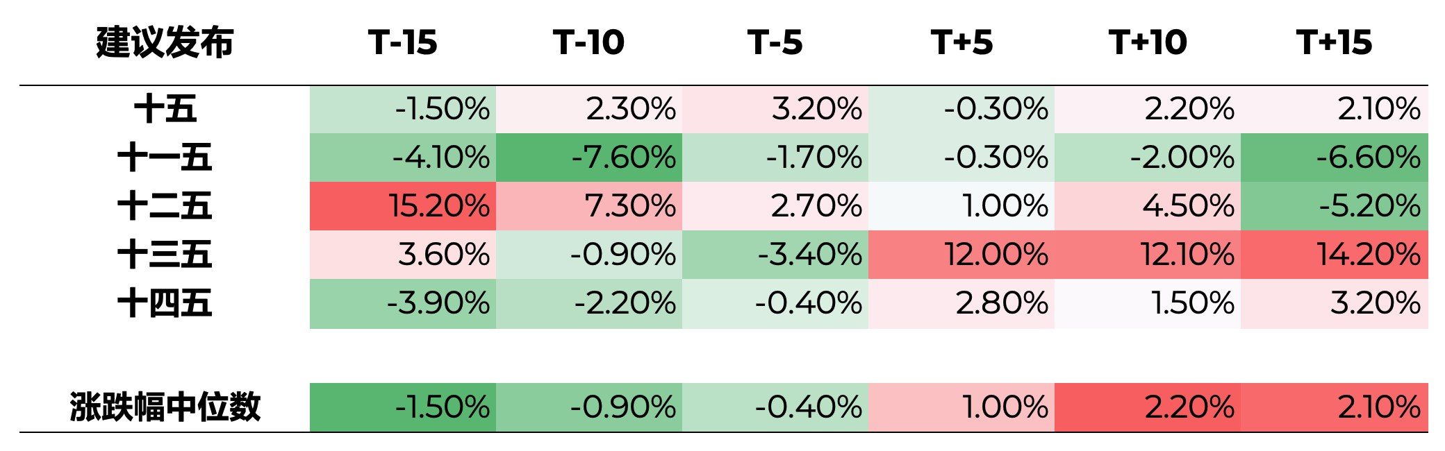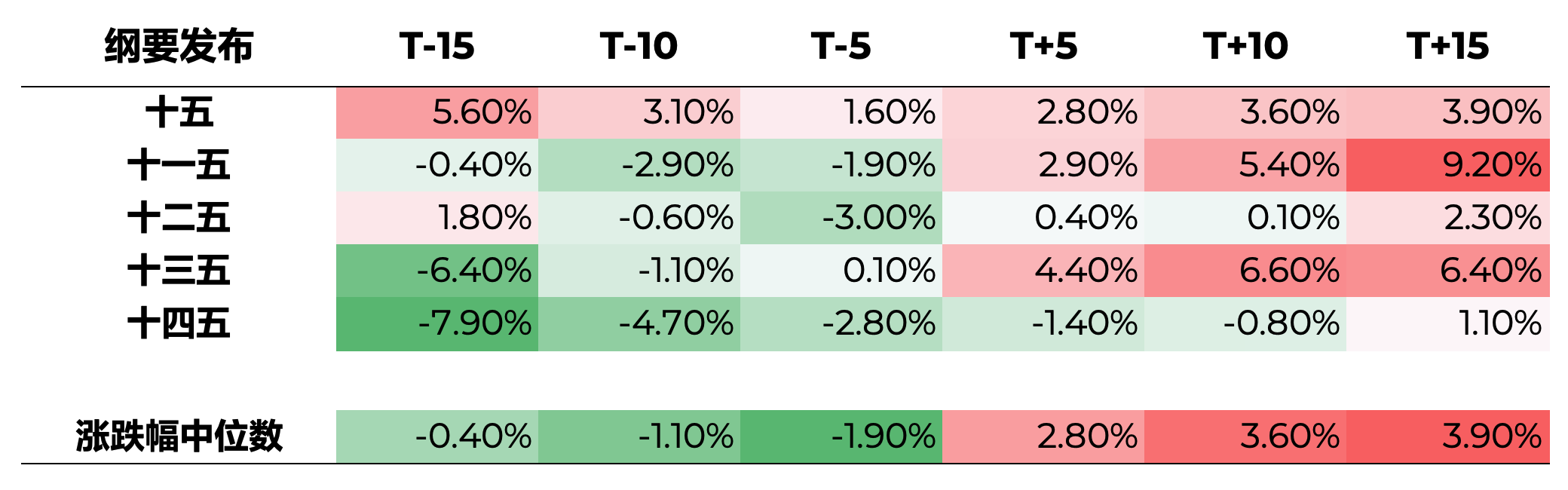 五年规划的发布对A股市场存在一定的日历效应。五年规划的发布分为三个关键节点:中央全会闭幕后的会议通稿、数日后发布的五年规划建议,以及次年两会期间正式发布的五年规划纲要。若以五年规划建议和纲要的发布作为事件日,并统计万得全A指数在事件窗口期(前后5、10、15个交易日)内的表现,从市场过往走势看,政策出台对市场往往具有短期驱动效应,可能源于市场对政策细则的积极反应。
