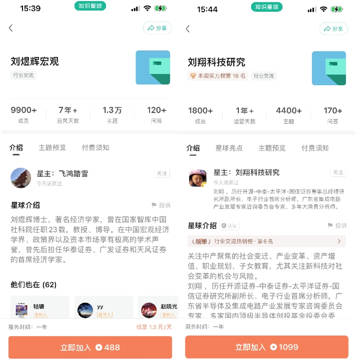此外,开源证券研究所原副所长、电子行业首席分析师刘翔去年也开通了自己的知识星球,当前订阅人数已破1800, 订阅费用已飙至1099元/年。