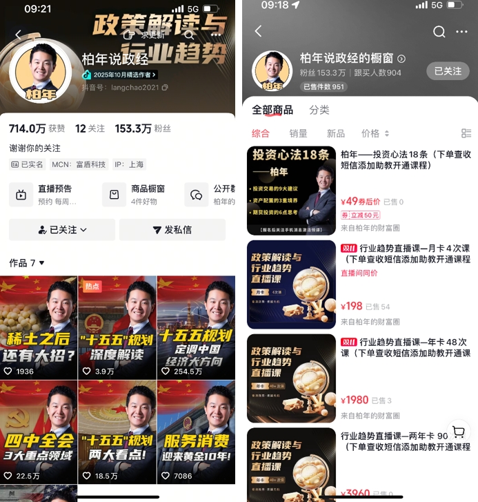 自然,这背后也有推手。页面显示,该账号已签约MCN公司富盾科技,有运营和推流的加持。在抖音橱窗、微信小店等平台,靳毅还上架了付费课程,课程内容包括宏观及行业趋势直播课、投资心法等,其中月卡收费198元,年卡收费1980元,跟买人数超900。