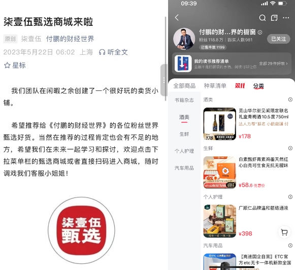 同样进驻抖音的还有前东北证券首席经济学家付鹏。早在2023年5月,付鹏通过公众号“付鹏的财经世界”官宣和团队创建了一个卖货小铺。其抖音账号的橱窗显示,目前上架的货品涵盖了书籍、酒、生鲜以及个人护理等品类。