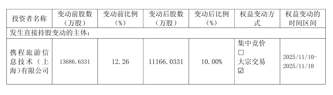 公告显示,本次权益变动后,携程上海持股比例由 12.26%变动为10.00%。