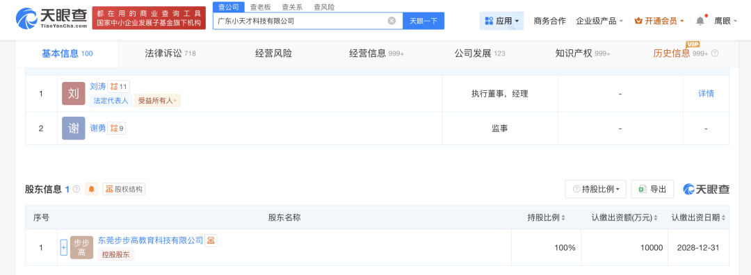 天眼查显示,小天才品牌所属公司全称为广东小天才科技有限公司,由东莞步步高教育科技有限公司100%控股。后者则是商业大佬段永平由步步高拆分出来的三大公司之一。