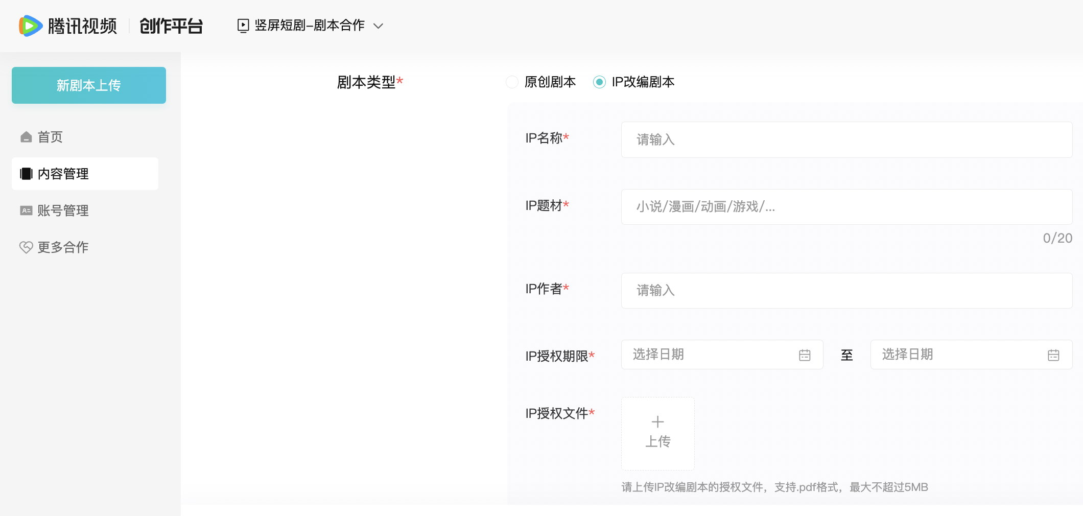 腾讯视频竖屏短剧剧本合作开放平台,IP改编剧本需提交授权文件。(图源:平台截图)